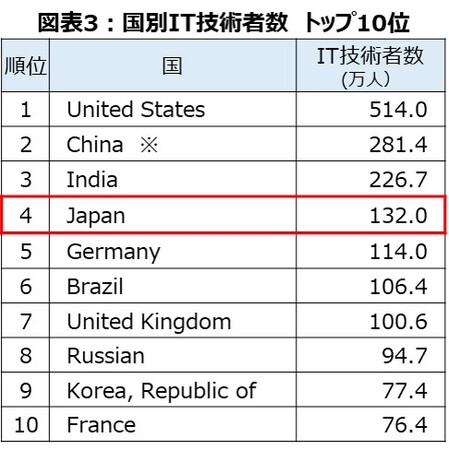各国のIT技術者数を国別でみると(図表3)、米国がトップで514.0万人、2位が281.4万人の中国(※1)、3位が226.7万人のインドと続きました。続いて4位は日本で、前年122万人より10万人増えた132.0万人、5位は114.0万人のドイツが入りました。1位から5位は2021年調査(※2)と順位の変動はありませんでした。