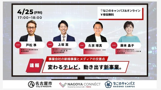4月25日(金)にNAGOYA CONNECTが開催する「事業会社の新規事業とメディアの交差点~変わるテレビ、動き出す新事業。~」にメ~テレ上坂嵩アナウンサーが登壇します。変わりゆく時代の中でのテレビ局の取り組みをお届けします。是非ご参加ください。