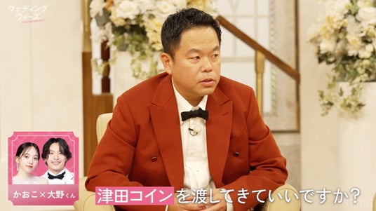 第1回脱落デスマッチの競技は、カップルのどちらか1人がタイマーのスイッチを持ち、30秒ピッタリを目指してキス、最も30秒から離れていた最下位カップルが脱落となる“愛の30秒キス”で競うことに。無条件で参加しなければならない該当者は暫定ランキング4位のハトミ・さやか、5位のセバス・サユリ、6位のだいご・ちひろ、7位のムン・るい、8位の柴助・マミモンカップル5組。ハトミ・さやかが28秒、セバス・サユリが29秒と好タイムを出す中、ムン・るいのチャレンジではタイマーを持ったるいが手でカウントする様子に「ちょっと遅くない?」とスタジオMC陣がざわつきます。結果36秒と大幅にオーバーしてしまったムン・るいに、津田篤宏は思わず立ち上がり「長ーい!」と絶叫しながら、持ちギャグ“スー”を披露。進行役の西村真二が「ここで“スー”が出ました」と実況するなど、津田の興奮ぶりにスタジオでは笑いが起きました。そして5組がチャレンジを終え、最も30秒から離れていたムン・るいの脱落が決定。これまでに獲得したウェディングコインを他のカップルに譲渡することができると知らされたムン・るいはいったいどのカップルにコインを譲ったのか…?MC陣が「完璧カップルじゃん」と称賛の声をあげたムン・るいの決断とは?