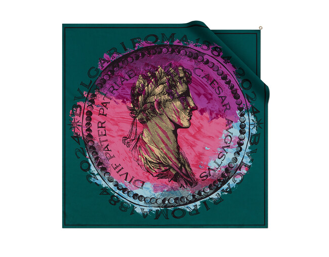 2024年春夏アクセサリーコレクションの最も際立った特徴を一つ一つのクリエイションに落とし込んだテキスタイルは、至高の素材と卓越した職人技で光と色の交錯を表現しました。魅惑的なセルペンティから伝説的なモネーテまで、ブルガリの最もアイコニックでスタイリッシュなモチーフに加え、ローマの文化遺産への終わりなきオマージュが新しい印象的な表現となって、無限のスタイリングを叶える鮮やかなスカーフやストールを生き生きと輝かせます。アウグストゥス シルクスカーフは想像上の古代のコインのように、皇帝の輝かしい横顔と創業140周年を記念した「BVLGARI ROMA 1884-2024」の銘文をメインに配しました。