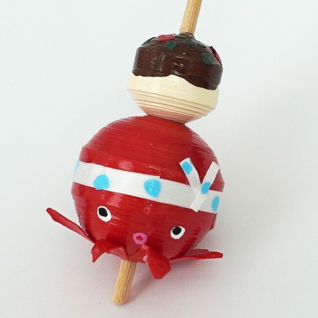 大阪のソウルフードといわれる粉もん料理のなかでも、お好み焼きと並んで人気の高い「たこ焼き」。今回は頭にハチマキを巻いた愛嬌あるタコチャンの上に、まんまるなたこ焼きが乗った、インパクト抜群の京こまを制作いただけます。
