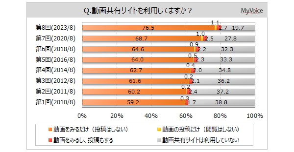 マイボイスコム株式会社(東京都千代田区、代表取締役社長:高井和久)は、8回目となる『動画共有サイト』に関するインターネット調査を2023年8月1日~5日に実施しました。調査結果をお知らせします。