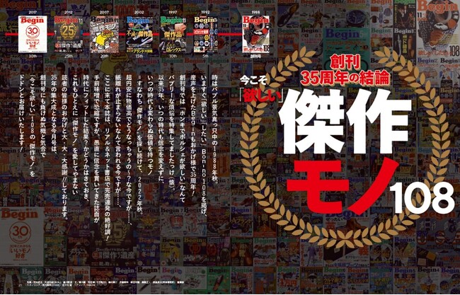 バブル景気真っ只中の1988年秋、【いますぐ「欲しい」「したい」Bon-no ₋煩悩₋ 108】を掲げ産声を上げた雑誌『Begin』。以来35年間、いつの時代も信念を変えずに、いつの時代も変わらぬ価値を持つモノ=すなわち “傑作モノ”を探し続けてきました。35年の集大成となる今月号は、創刊号にも負けぬ気概と気合で「今こそ欲しい」108の傑作モノをドドンとお届けいたします!