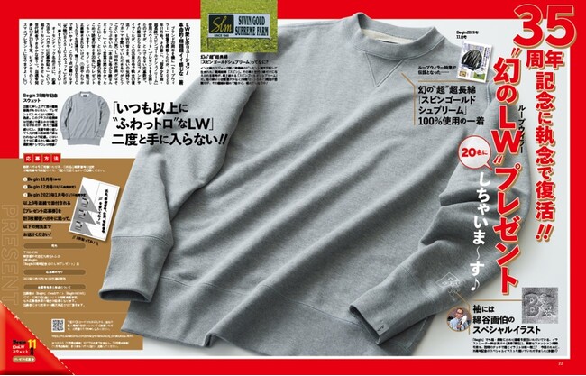 さらに今回は読者プレゼントも大盤振る舞い! ワガママを聞いてもらったのは、世に“吊り編みスウェット”を広めた立役者として『Begin』ではおなじみのブランド「ループウィラー」。幻の“超”超長綿として名高い「スビンゴールドシュプリーム」を贅沢に使用したスウェットを20名様にプレゼント! いつも以上に“ふわっトロ”なループウィラー、ココで逃しちゃ二度と手に入りませんよ。