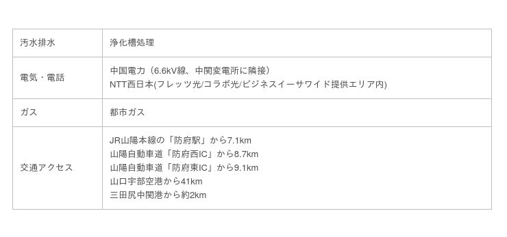 山陽自動車道「防府西インターチェンジ」から約8.7km、「防府東インターチェンジ」から約9kmと近接しており、中国・四国地域だけでなく、関西・九州地域へのアクセスも容易です。また、JR山陽本線「防府駅」から7.1kmに位置しているため、職住近接の就労環境も整っています。