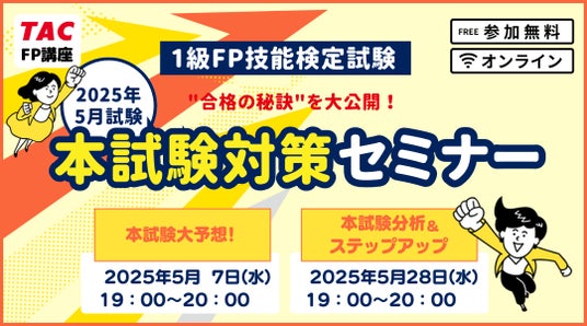 ファイナンシャル・プランナー(以下、FP)、簿記検定試験、税理士、公認会計士などの資格取得に向けた教育サービスを展開しているTAC株式会社(東京都千代田区、代表取締役社長:多田 敏男)は、5/25(日)に実施される『FP技能検定試験』の解答速報「本試験解説Web動画(1級)」を無料で視聴できる専用ページをご用意いたしました。