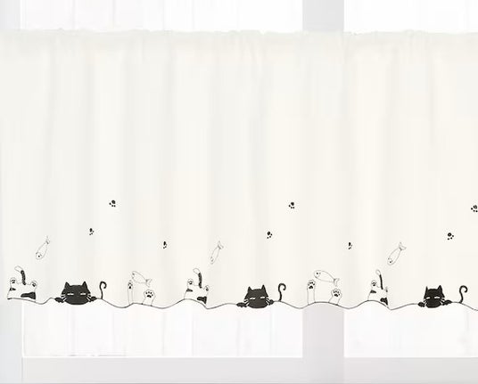 突っ張り棒に通して使える小窓カーテンです。裾の部分に顔を出したネコの刺繍がかわいい。
