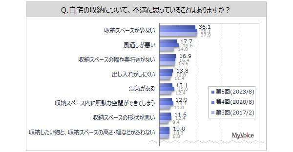 自宅の収納で不満に思っていることは(複数回答)、「収納スペースが少ない」が36.1%、「風通しが悪い」「収納スペースの幅や奥行きがない」が各2割弱、「出し入れがしにくい」「湿気がある」がなど各1割強です。