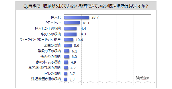 自宅で収納がうまくできない・整理できていない収納場所は(複数回答)、「押入れ」が28.7%、「クローゼット」が18.1%、「押入れの上の収納」「キッチンの収納」「ウォークイン・クローゼット、納戸」が各1割強です。「クローゼット」は、女性30~50代や持ち家・集合住宅居住者で高くなっています。借家居住者では、「押入れ」が高い傾向です。