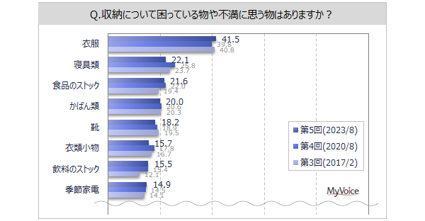 マイボイスコム株式会社(東京都千代田区、代表取締役社長:高井和久)は、5回目となる『収納』に関するインターネット調査を2023年8月1日~5日に実施しました。調査結果をお知らせします。