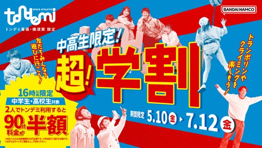 株式会社バンダイナムコアミューズメントは、屋内アスレチック施設「トンデミ幕張」「トンデミ横須賀」にて、2024年5月10日(金)から7月12日(金)の期間中、16時以降のトンデミ利用2人以上で1人あたりの90分料金が半額になる中高生限定「超!学割」を実施します。