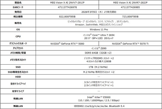 前面に13.3インチのタッチパネル、最新のDLSS 4.5のマルチフレーム生成に対応したNVIDIA(R) GeForce RTX(TM) 5080を搭載し、大容量64GBメモリ、5G LAN・Wi-Fi 7の高速通信機能を備えた「MEG Vision X AI 2NVV7-281JP」、RTX 5070 Tiを搭載した「MEG Vision X AI 2NVR7-282JP」が新たにラインナップに加わります。