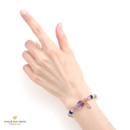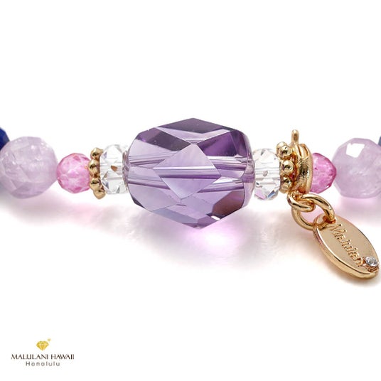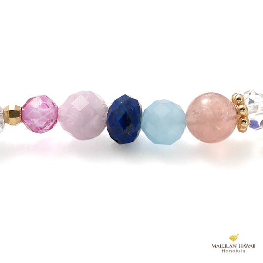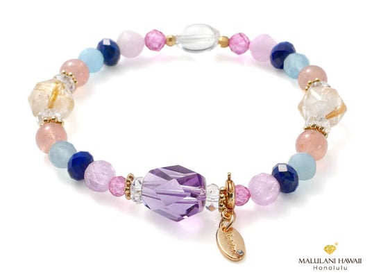 アメジストやラピスラズリなど、閃きや直感を高める聖なる石に、クンツァイトやアクアマリンなど穏やかな幸福を願う石で仕立てたブレスレット。