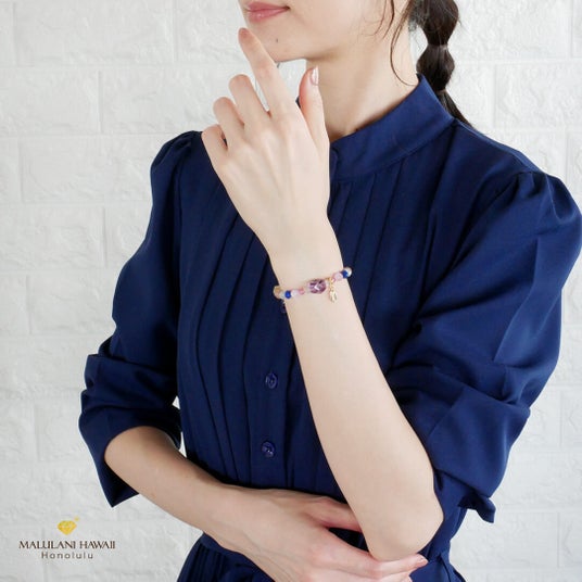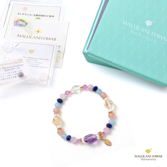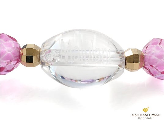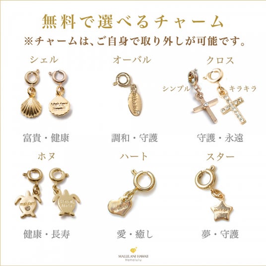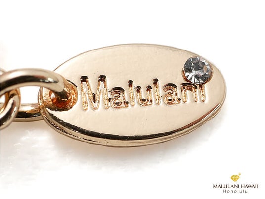 水晶とオリジナルチャームには、ハワイ語で「神に護られた」を意味する「Malulani」と刻印。