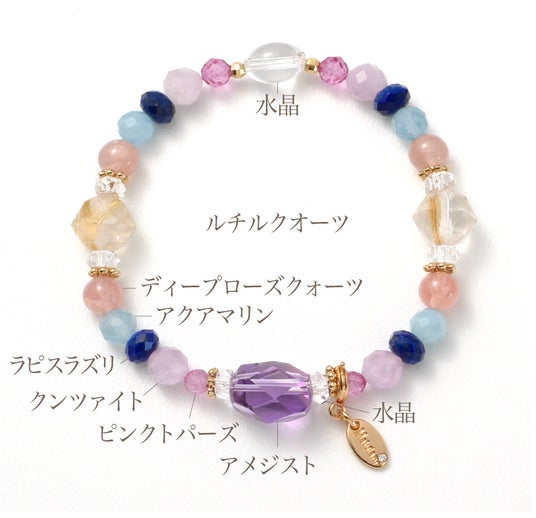 アメジストやラピスラズリなど、パワーストーンを代表する天然石に、ディープローズクォーツやアクアマリンなど癒しの石も組み込み、どなたにも愛されるデザインで作成したブレスレットは、「お願い事を託しながら、おしゃれに持ちたい」という方にぴったり。