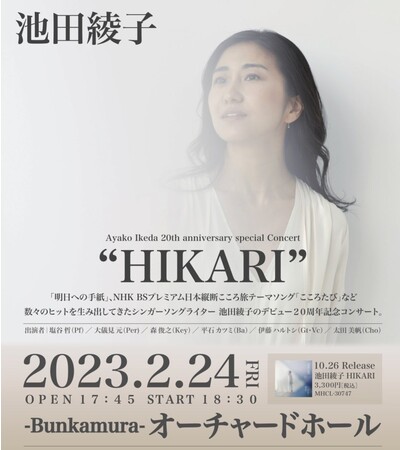 デビュー20周年を迎えNew Album『HIKARI』をリリースし、ツアーの敢行や数々のイベント出演を行ってきた池田綾子が、20周年の締めくくりとして2月24日、オーチャードホールにてコンサートを開催する。