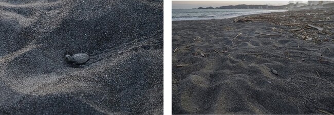 9月16日の朝に砂の中から這い出してきた4個体の子ガメたちは、甲長や体重の計測をし、放流後の生存率が高まるとされる夜に沖合へ到達できるよう夕刻に放流されました。史上最も暑いとされる酷暑を乗り越えて誕生した子ガメたちは、目の前の太平洋に向かって砂浜を力強く歩み、飼育員の見守る中、波間に姿を消していきました。