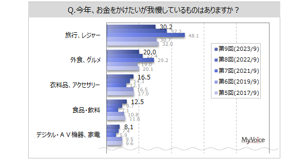 我慢しているものは(複数回答)、「旅行、レジャー」が30.2%、「外食、グルメ」が20.0%です。これらの上位2位と、「映画、ライブ、演劇、美術展など文化・芸術鑑賞」「デートや飲み会など、友人知人とのコミュニケーション」は、2021年調査でいったん増加しその後減少しています。