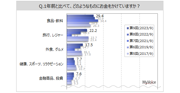 1年前と比べてお金をかけているものは(複数回答)、「食品・飲料」が29.4%です。「旅行、レジャー」「外食、グルメ」は2割前後で、いずれも2021年調査でいったん減少しその後増加しています。