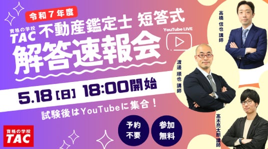 不動産鑑定士、宅建士、司法書士、日商簿記、公認会計士、公務員など、さまざまな資格取得をサポートするTAC株式会社(東京都千代田区、代表取締役社長:多田敏男)は、2025年(令和7年)不動産鑑定士試験の「短答式試験解答速報会」を、試験実施当日である5月18日(日)18:00からYouTube Liveでお届けします。また、短答式試験のボーダーラインや論文式試験の学習法を解説する「短答式試験解説会/論文式試験学習法セミナー」を、5月21日(水)19:00からZoomウェビナーで開催いたします。