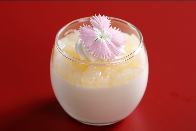 洋梨のムースと洋梨のジュレをマスカルポーネのムースで包み、洋梨のコンポートをトッピングしました。洋梨のとろけるような食感と芳醇な香りをお楽しみいただけるグラススイーツです。
