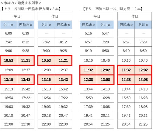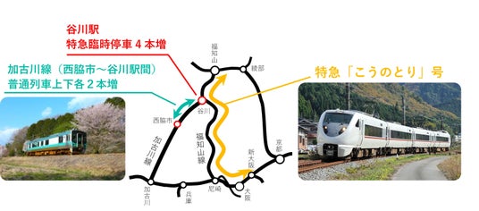 加古川線では、西脇市~谷川駅間の列車を1日2往復(上下各2本)増発、および福知山線 谷川駅で一部の特急「こうのとり」号を乗り降りしていただけるよう取り扱いを変更する実証実験を行います。