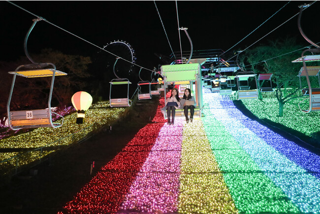 20種類のアクティビティを楽しめる空中ネットアスレチック「ハッスルスパイダー」がカラフルにライトアップし、光に照らされた中で思いっきり身体を動かして遊べる「光の空中アスレチック」として楽しめるほか、小さなお子様も楽しめるアトラクションがあるパディントンタウンでは、光の中をトロッコ型のミニコースターで駆け抜ける「とつげき!パディントン探検隊」や、のんびり楽しく光の汽車の旅を楽しめる「しゅぱつ!パディントン号」などが揃うなど、園内には、イルミネーションに囲まれながら、10種類のナイトアトラクションが楽しめます。そのほか、全長250mのリフトに乗ってイルミネーションの上空を空中散歩する「虹のリフト」や標高370mにそびえる「光のかんらんしゃ」など、起伏に富んだアウトドアリゾートならではの「空から眺めるイルミネーション」が充実しています。