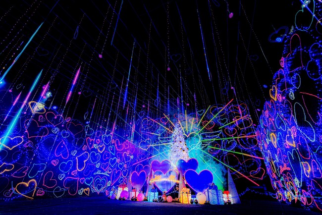 そのほかの目玉「ハートフルイルミネーション」では、360度1,000個ものハートがいっぱいにちりばめられた空間が広がり、クリスマスツリーとハートのイルミネーションが音楽に連動して光り輝く、約5分間のエンターテインメントショーを展開いたします。ムービングライトやレーザービームを使用した没入感あふれるショーにご期待ください。