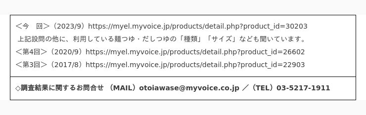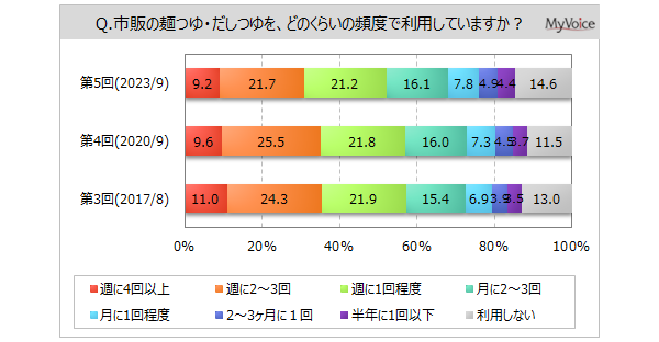マイボイスコム株式会社(東京都千代田区、代表取締役社長:高井和久)は、5回目となる『麺つゆ・だしつゆ』に関するインターネット調査を2023年9月1日~5日に実施しました。調査結果をお知らせします。