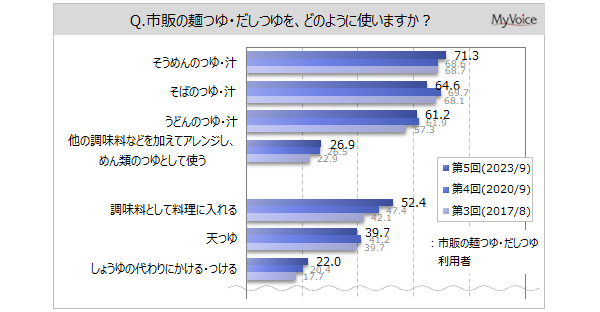 市販の麺つゆ・だしつゆ利用者の利用方法は(複数回答)、「そうめんのつゆ・汁」が71.3%、「そばのつゆ・汁」「うどんのつゆ・汁」が各6割強となっています。「調味料として料理に入れる」は52.4%、過去調査と比べて増加傾向です。