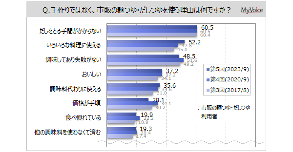 市販の麺つゆ・だしつゆを利用する理由は(複数回答)、「だしをとる手間がかからない」が利用者の60.5%、「いろいろな料理に使える」が52.2%、「調味してあり失敗がない」が48.5%です。