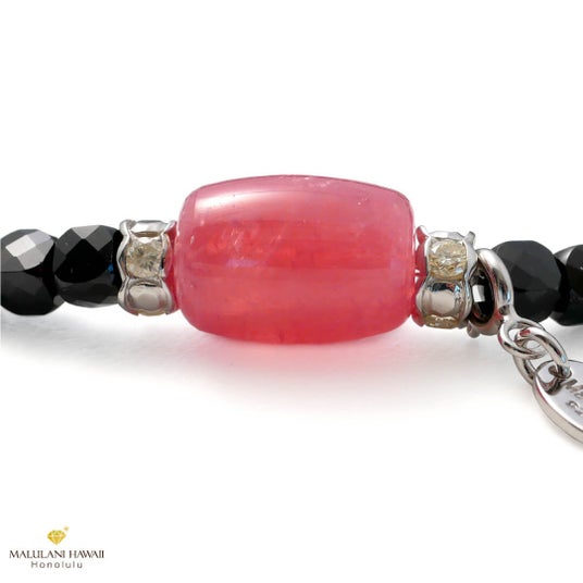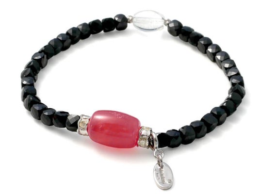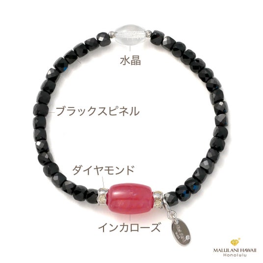 一粒でも十分な魅力を放つ真紅のインカローズを、ダイヤモンドとブラックスピネルで仕立てたブレスレットは、「インカローズを持ちたいけれど、甘すぎるデザインはちょっと」とお思いになられる方にもおすすめ。
