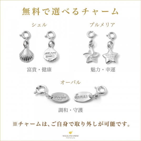 キラリと光るオリジナルチャームには、「神に護られた」という意味のハワイ語「Malulani」と刻印。