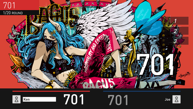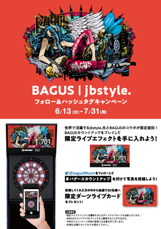 2020年に『BAGUS × jbstyle.』コラボキャンペーンを実施し、多くのダーツプレイヤーから絶賛された限定ライブエフェクト*のビジュアルが復刻版として登場!jbstyle.氏が描き下ろしたデザインはそのままに、背景色を変え新たなイメージで復活いたしました。6月13日(火)から、バグースダーツ対象店舗にてバグースカウントアップをプレイされた方に限定で配布をいたします。