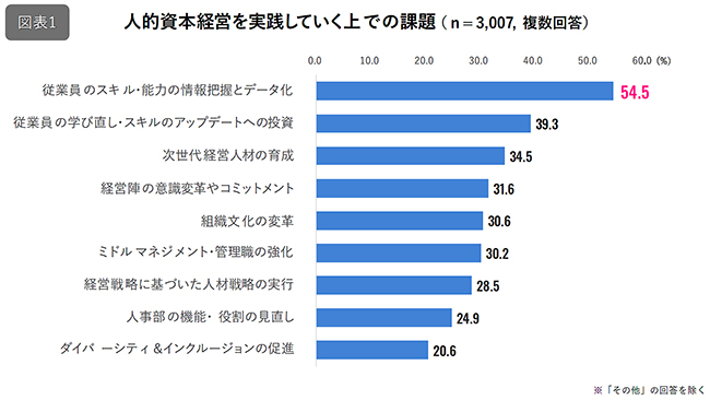 「従業員のスキル・能力の情報把握とデータ化」が最上位。そもそも人的資本の把握ができていない