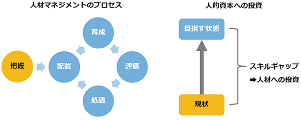 人材を、把握し、配置し、育成し、評価し、処遇するという人材マネジメントのプロセスの中で「従業員のスキル・能力の情報把握とデータ化」は最初の段階である「把握」に該当します。一人ひとりの従業員がどのようなスキル・能力や経験を持っていて、どのような人が社内のどこにいるのか、そういった把握ができていないとその後のプロセスもうまく機能していきません。