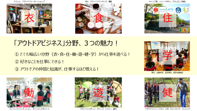 圧倒的な1.アウトドア経験、2.企画と実践の機会、3.ビジネスを学ぶリアルな機会により、幅広い分野(衣・食・住・働・遊・健・学の7分野)の進路を実現!