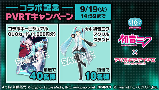 PVの中では、16周年記念衣装を身に纏った『初音ミク』が、『アリスギア』の3Dモデルで動く姿が見られ、本コラボイベントにてプレイアブルキャラクターとして登場することを発表いたしました。