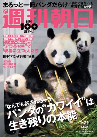 今週の週刊朝日は、上野動物園の双子の赤ちゃんパンダ、シャオシャオとレイレイが1月12日から一般公開されることを記念して、まるっと一冊モフモフまみれになれるパンダ号をお届けします。上野動物園の前園長が語る、ランランとカンカンからの「パンダ愛50年物語」、パンダの可愛さの秘密を専門家が分析した「パンダに学ぶ“カワイイ”の生存戦略」、遠藤憲一、山田パンダらが語るパンダ愛、知られざる日中パンダ外交秘史など、特集も大充実。双子パンダの成長アルバムに加え、「パンダの楽園」和歌山アドベンチャーワールドの撮りおろしなど、グラビアもパンダだらけです。通常記事も、大好評・性のすれ違い特集の第3段「妻とできない夫の深い事情」や、「アラウンド卒寿」の7人に90歳でも現場で働く秘けつを聞いたインタビュー集、新作歌舞伎「プペル」で親子共演に臨む市川海老蔵さんへのインタビューなど、豪華なラインナップでお届けいたします。