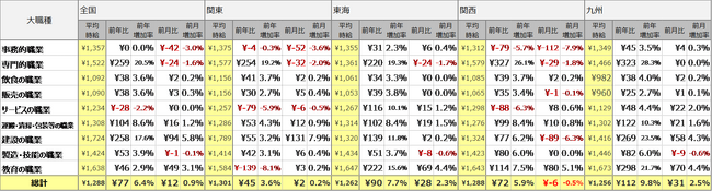 関東エリアの平均時給は1,301円(前年45円増、前月比2円増)、東海エリアの平均時給は1,262円(前年比90円増、前月比28円増)、関西エリアの平均時給は1,288円(前年比72円増、前月比6円減)、九州エリアの平均時給は1,256円(前年比112円増、前月比31円増)となりました。