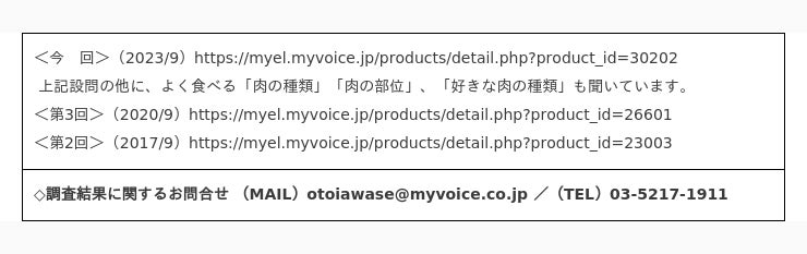 マイボイスコム株式会社(東京都千代田区、代表取締役社長:高井和久)は、4回目となる『精肉類・肉料理』に関するインターネット調査を2023年9月1日~5日に実施しました。調査結果をお知らせします。