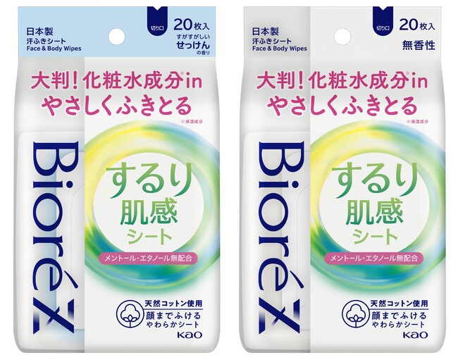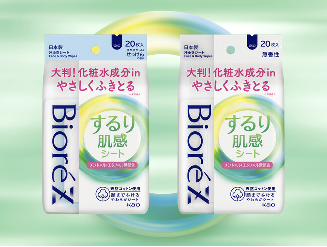 そこで『ビオレZ』は、メントール・エタノール無配合のボディシート「するり肌感シート」を新発売。化粧水成分(保湿)配合で、液をたっぷり含んだ大判シートです。乾燥が気になる季節にも使いやすく、1枚で全身やさしくふきとれます。