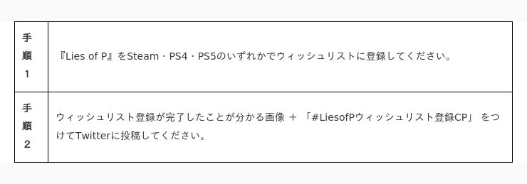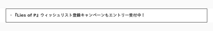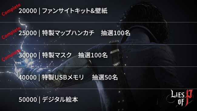 現在、ウィッシュリスト登録者数目標を達成する毎に、表示のノベルティ制作とプレゼントキャンペーンを展開する日本限定の企画“『Lies of P』ウィッシュリスト登録キャンペーン”もまだまだエントリー受付中です。