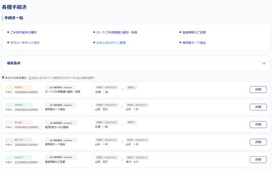 ご利用可能枠の増枠や登録情報変更など、法人カードに関する各種手続きの申請状況が、一目で把握できる機能です。