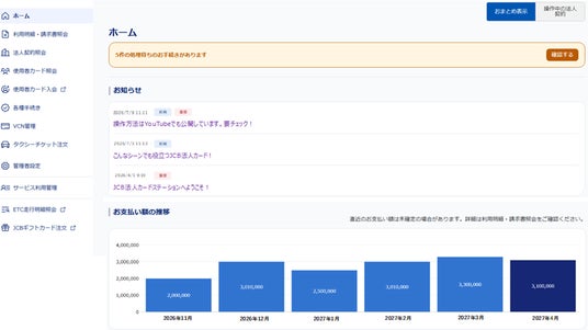 株式会社ジェーシービー (本社:東京都港区、代表取締役会長 兼 執行役員社長:二重 孝好、以下:JCB)は、中堅・大企業向け法人カード管理者用WEBサービスを刷新し、JCB法人カードステーションとしてリリースいたします。