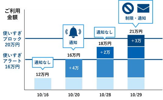 例:「使いすぎアラートの設定金額が16万円、「使いすぎブロック」の設定金額が20万円の場合