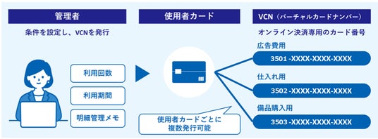 利用回数・期間・金額など用途に応じた利用条件を設定して、オンライン決済で利用可能なカード番号を即時発行できます。