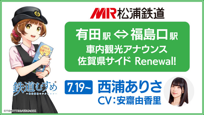 鉄道むすめ 西浦ありさ(松浦鉄道 広報担当・有田町初代観光大使)が、松浦鉄道の車内観光アナウンスを7月19日より務めることとなりました。アナウンスは松浦鉄道佐賀県サイド(上りは今福~黒川、下りは有田~浦ノ崎の区間)で聞くことができます。