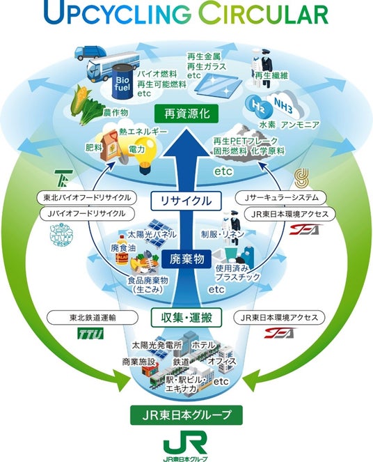 JR東日本グループは、当社グループ施設などから発生する廃棄物を、グループ会社などと連携し、収集・運搬、再資源化、グループ内での利活用による『UPCYCLING CIRCULAR』の実現を目指しています。