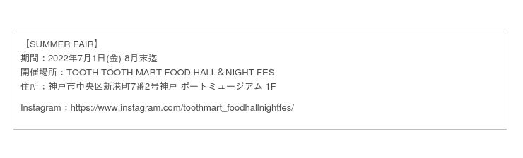 「神戸ポートミュージアム」1階の神戸最大級のフードホール「TOOTH TOOTH MART FOOD HALL&NIGHT FES」にて、~2022年8月31日まで夏フェア開催。